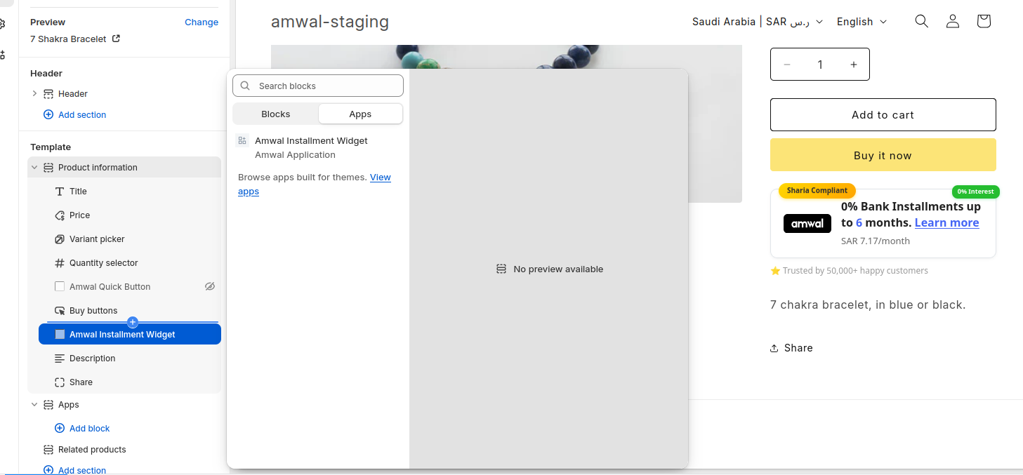 This guide explains how to embed the Amwal Installment Widget on Shopify Product and Cart pages.