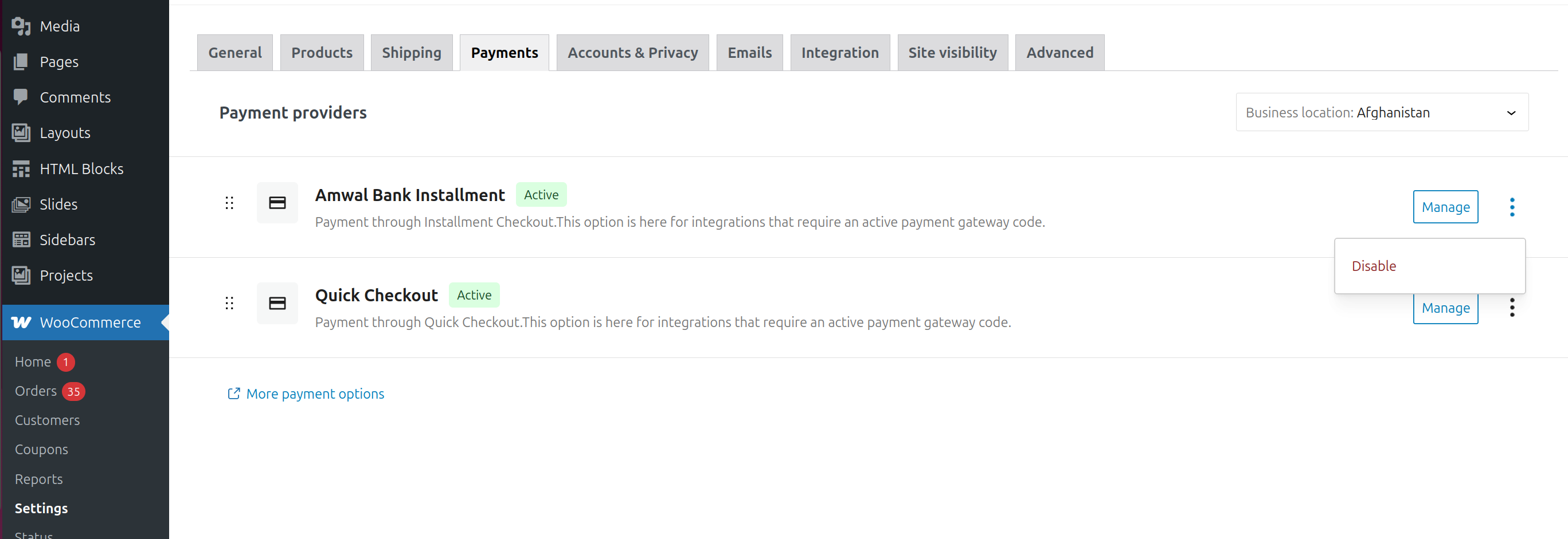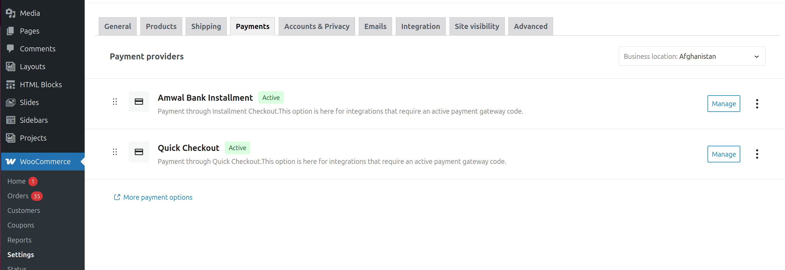 - You can find Amwal Payments in the admin menu > WooCommerce > Settings > Payments.